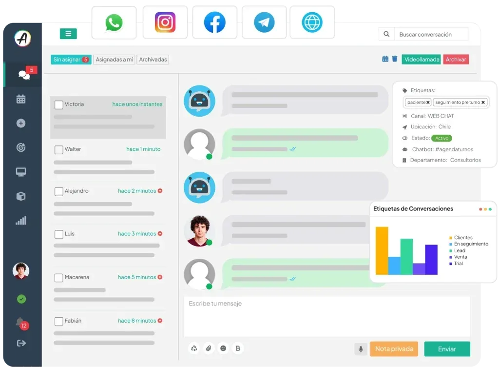 Puedes integrar Facebook, Instagram, WhatsApp, Telegram, y más, unificando todas tus interacciones en una sola plataforma para una gestión eficiente y centralizada.