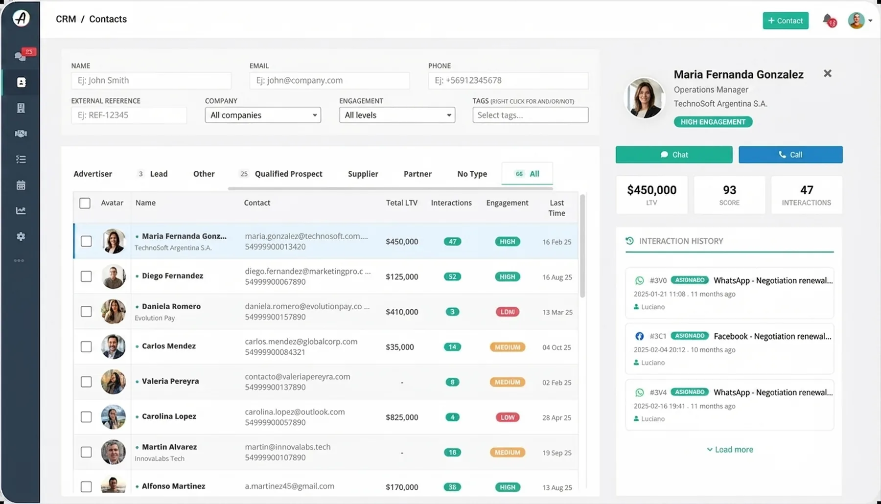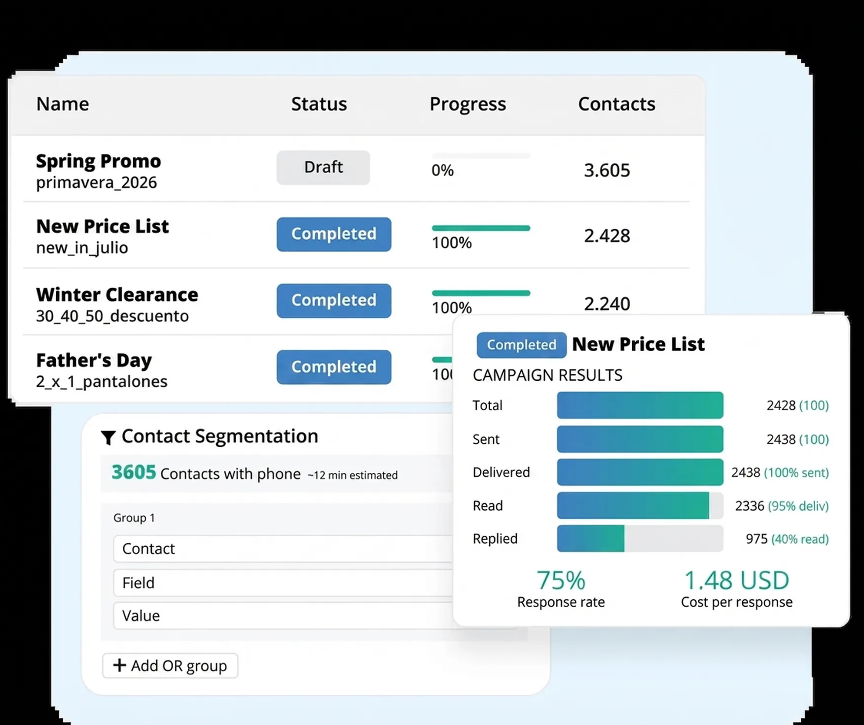 AsisteCRM you select the exact segment from your contact base and launch a WhatsApp or Email campaign, all from one place.