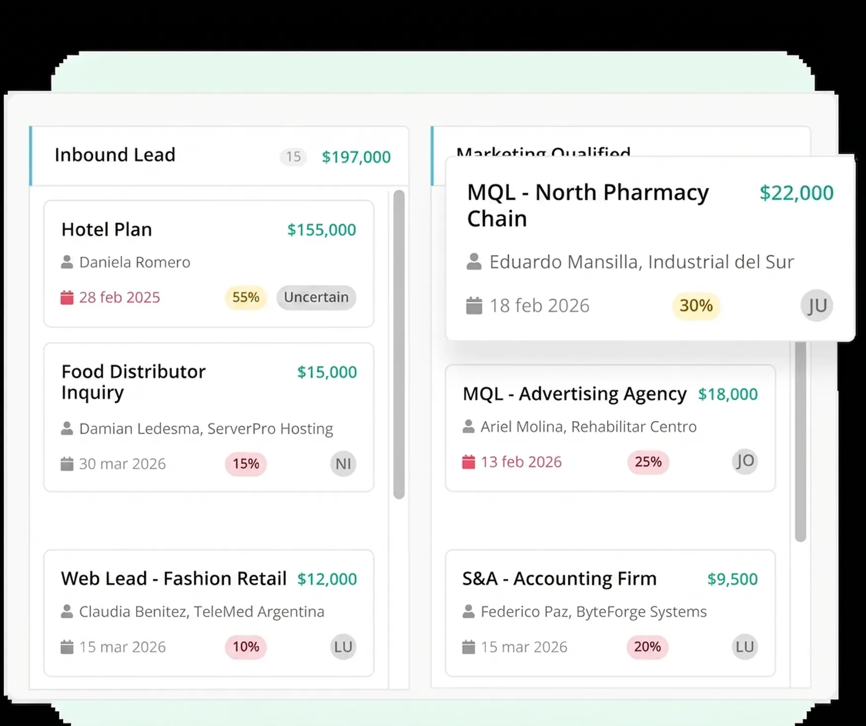 Yes. Multiple pipelines with different permissions. Sales sees its opportunities. Support sees its own. Multi-currency included: USD, ARS, EUR, MXN, CLP, COP, BRL, PEN.