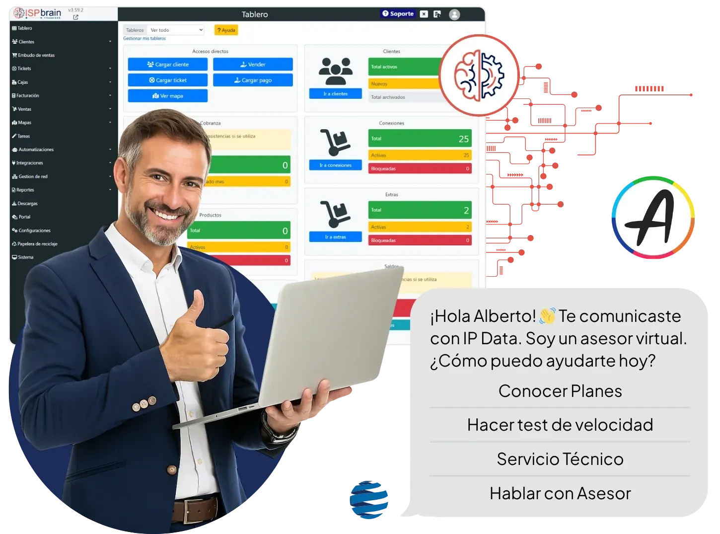 La integración oficial que combina la robustez de ISP Brain con la inteligencia de AsisteClick. Agiliza cobros, soporte y ventas en cuestión de minutos, con bots potentes y derivados al equipo correcto cuando lo necesites.