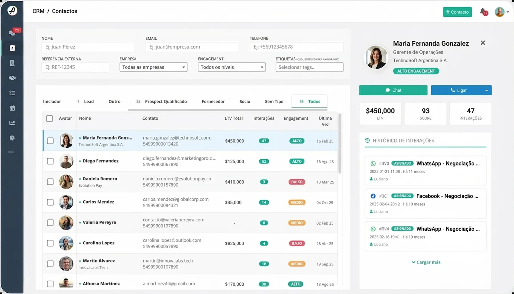 Maria escreve pelo WhatsApp. Juan escreve por email. Ambos da mesma empresa. O AsisteCRM os agrupa automaticamente pelo domínio do email. Você vê o histórico completo do relacionamento comercial, não apenas conversas isoladas. Quando Maria pede um desconto, você sabe que Juan já comprou 3 vezes este ano.
