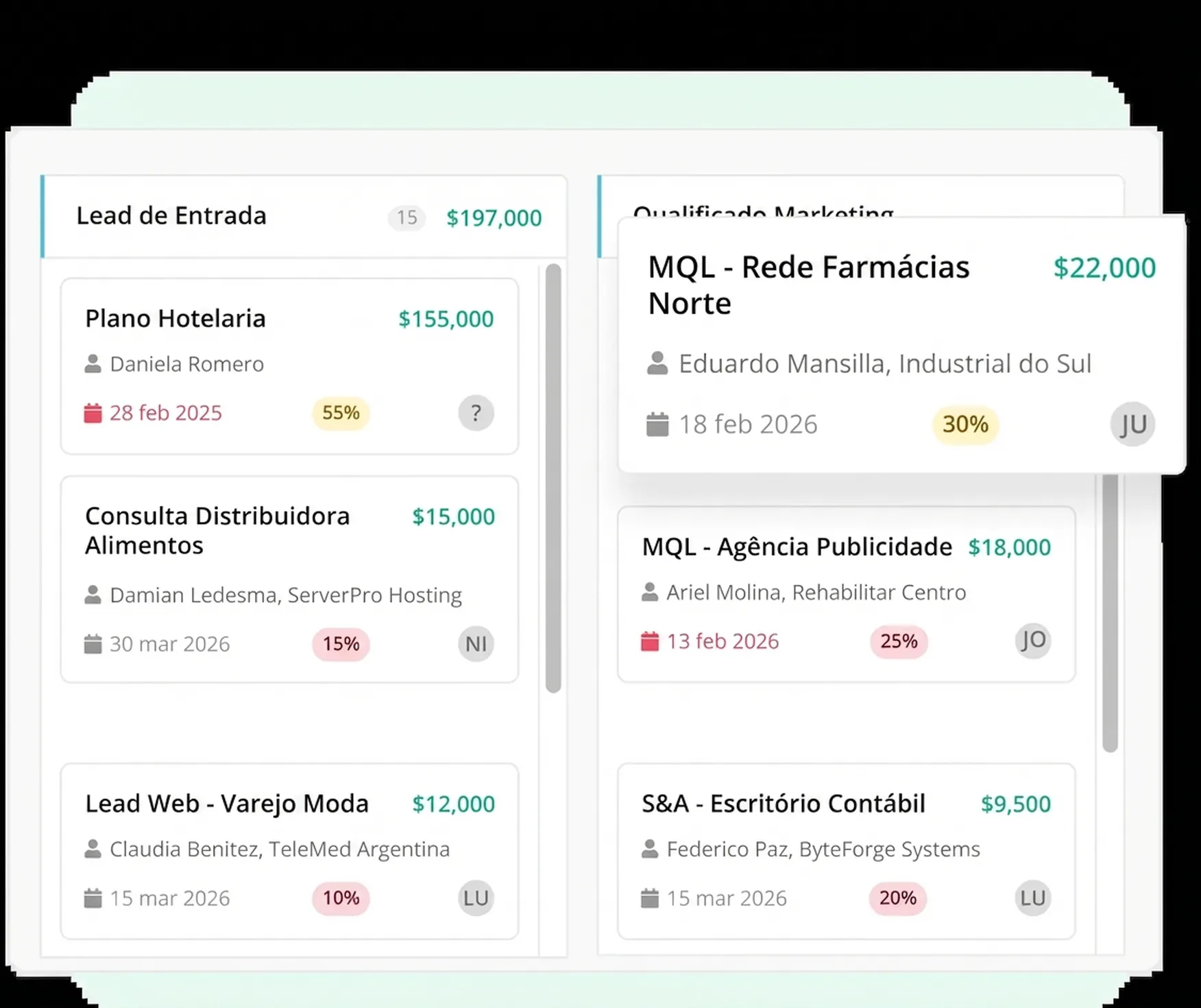 Sim. Múltiplos pipelines com permissões distintas. Vendas vê suas oportunidades. Suporte vê as suas. Multi-moeda incluída: USD, ARS, EUR, MXN, CLP, COP, BRL, PEN.